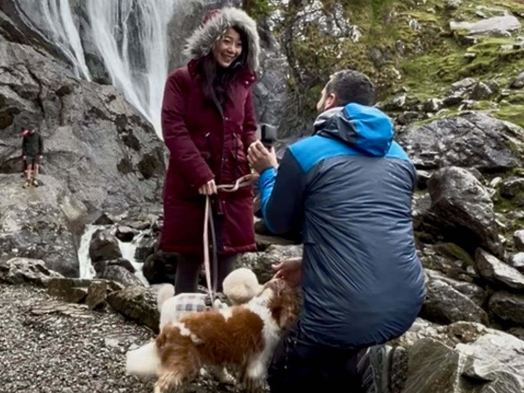 On a rainy and windy (typical British) hike to Aber Falls in Snowdonia National Park, Julie stood in front of the waterfall with Rubio and Rosie, waiting for Asier to set up the camera.